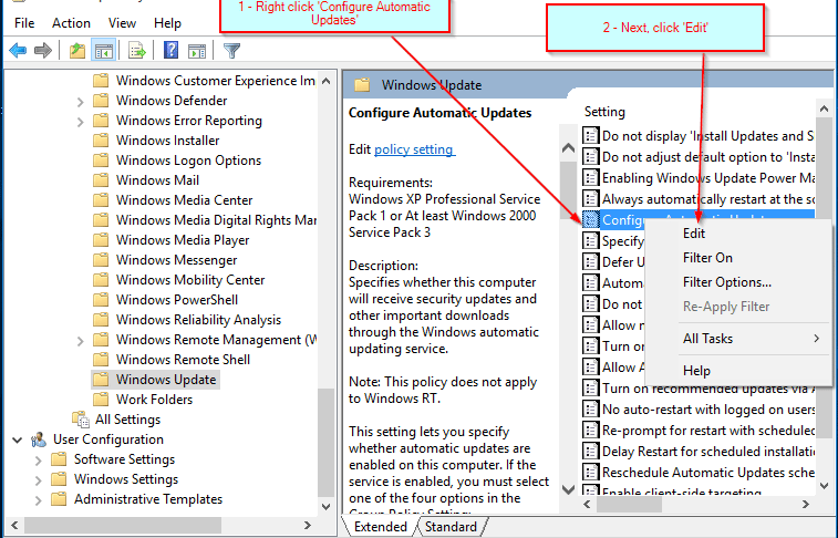 5 Right click ‘Configure Automatic Updates’, then click ’Edit’.