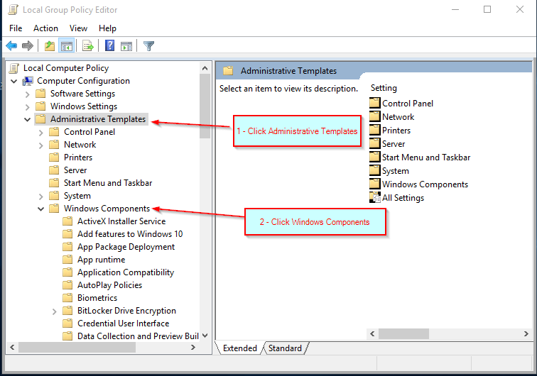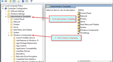 3 Under Computer Configuration (which is under Local Computer Policy), first click ‘Administrative Templates’ to expand that menu. Then click ‘Windows Components’ to expand that menu.