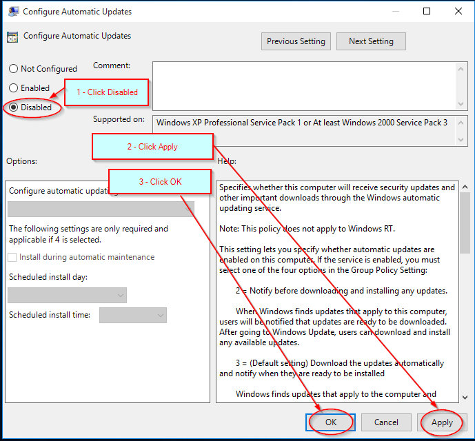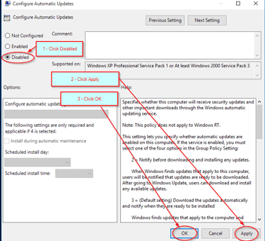6 Click ‘Disabled’, then ‘Apply’, then ‘OK’.