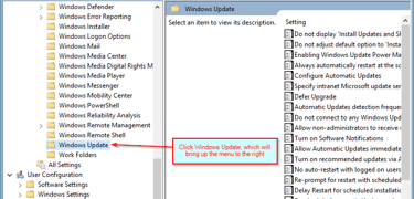 4 Scroll down and click ‘Windows Update’ to bring up the menu shown on the right hand side of the screen below.